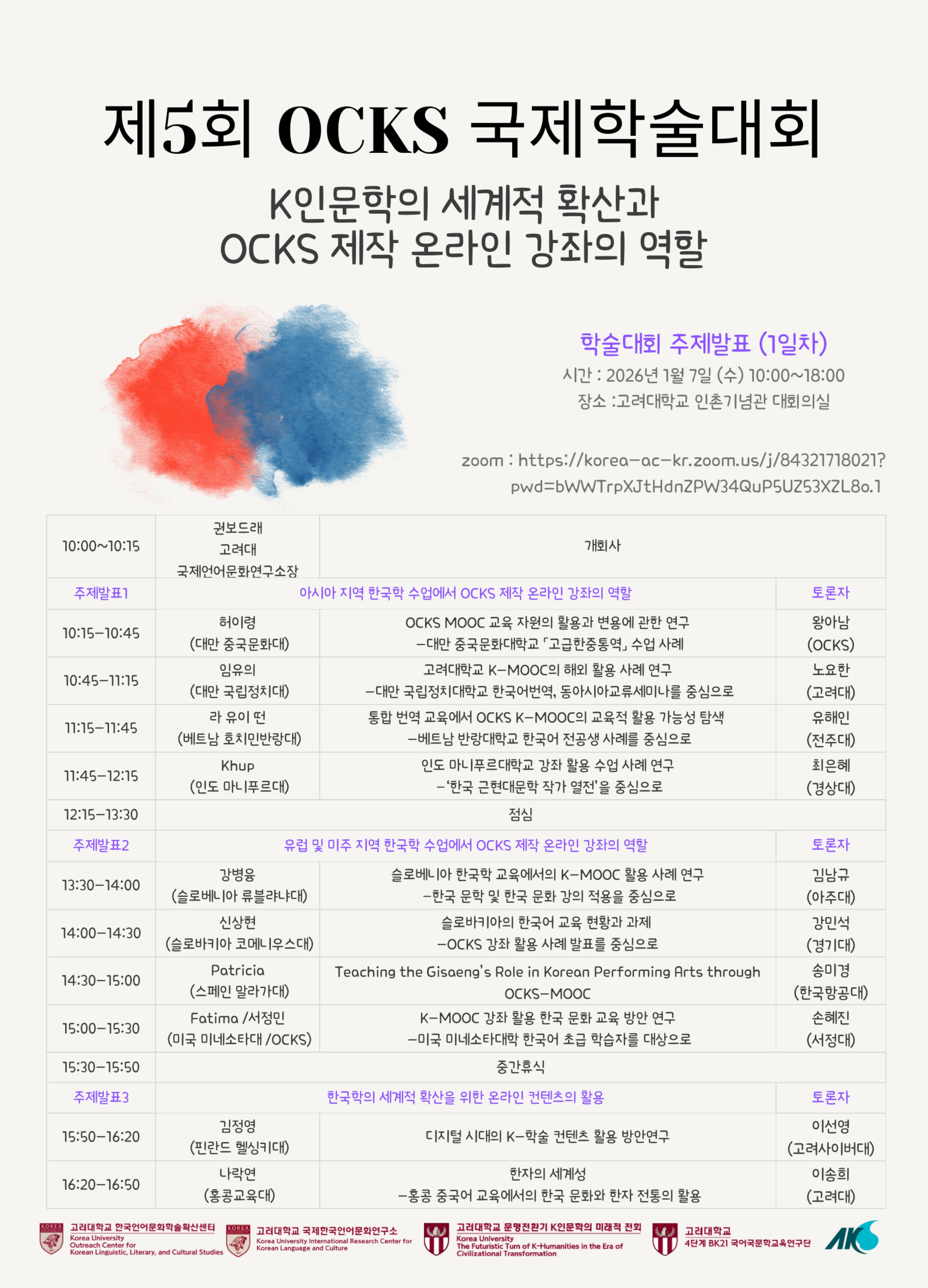 고려대학교 한국언어문화학술확산센터에서는 “K인문학의 세계적 확산과 OCKS 제작 온라인 강좌의 역할”을 주제로 제5회 OCKS 국제학술대회를 개최합니다.