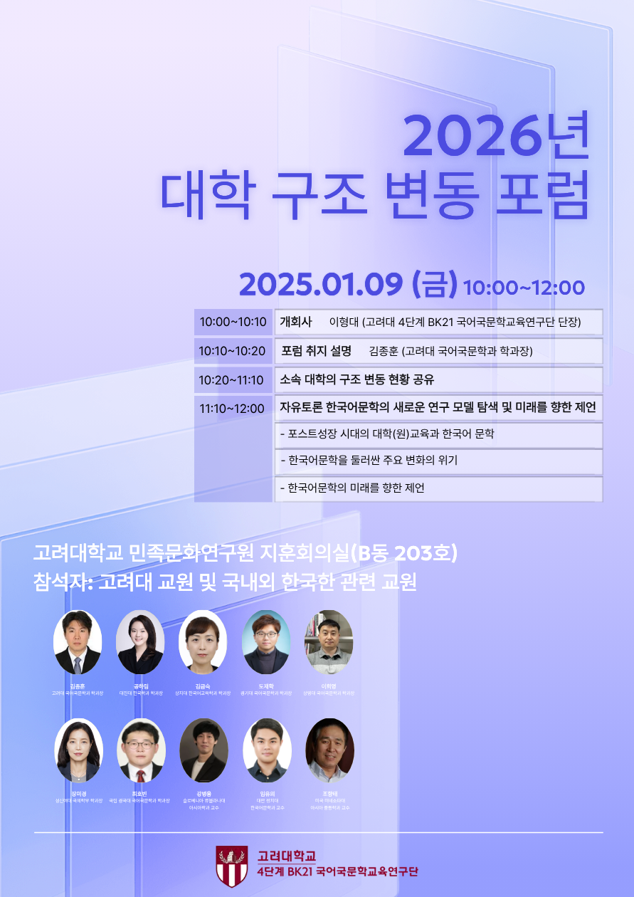 고려대학교 4단계 BK21 국어국문학교육연구단은 포스트성장 시대 대학(원) 교육 환경 변화 속에서 한국어문학 교육·연구의 현재를 점검하고 미래 방향을 모색하고자 <대학 구조 변동 포럼>을 개최합니다.