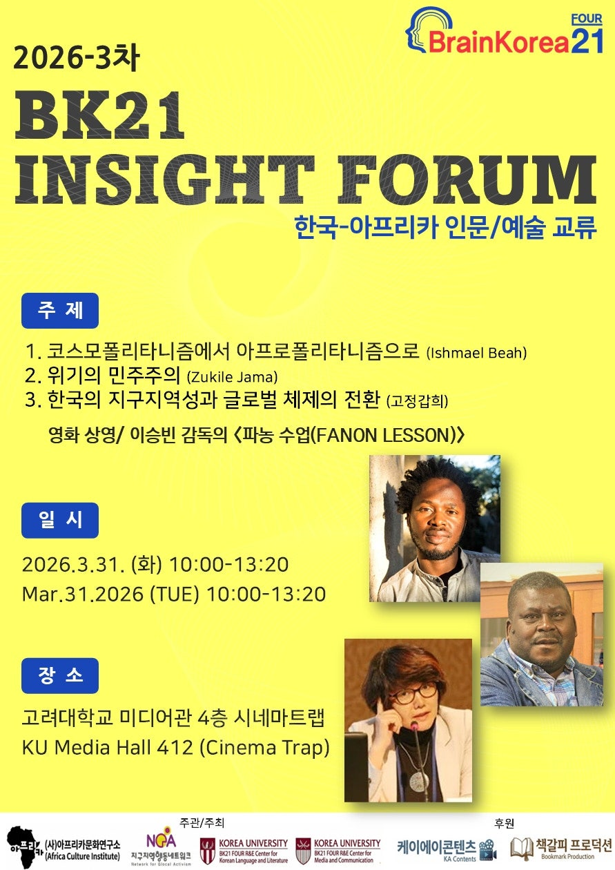 | 제목 | 이슈마엘 베아(스텔렌보스고등연구소(STIAS) 펠로우), 주킬레 자마(남아프리카공화국 스와힐리어 위원회(SLBSA) 위원장), 고정갑희(지구지역행동네트워크 대표) 초청 "한국-아프리카 인문/예술 교류" |