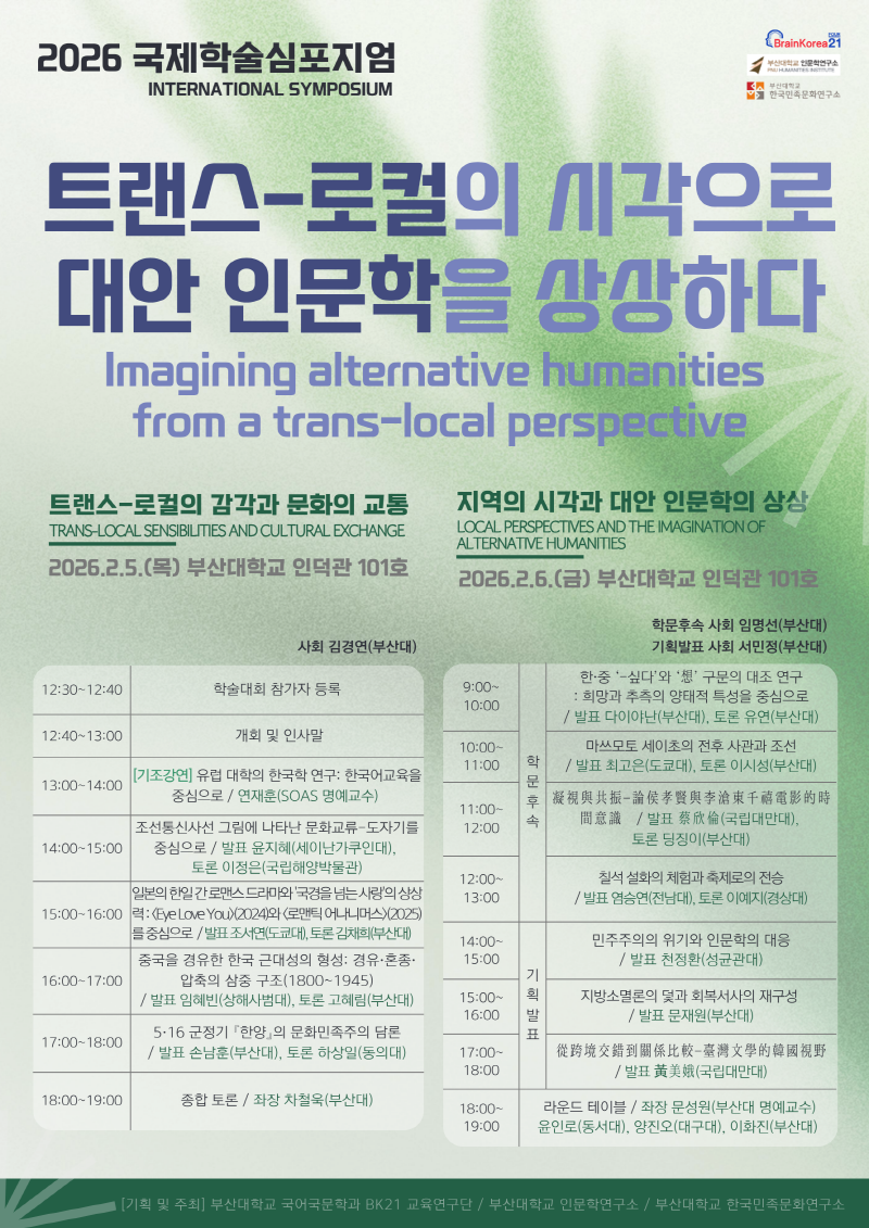 부산대학교 국어국문학과 BK 교육연구단(Brain Korea, 한국연구재단 대학원역량강화사업)은 인문학연구소, 한국민족문화연구소와 공동으로 2026년 2월 5일(목)부터 6일(금)까지 국제학술 심포지엄 〈트랜스-로컬의 시각으로 대안 인문학을 상상하다〉를 개최합니다.