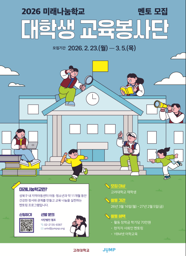 지역과 함께 성장하는 배움의 여정에 동참할 2026 미래나눔학교 장학샘 여러분을 기다립니다!